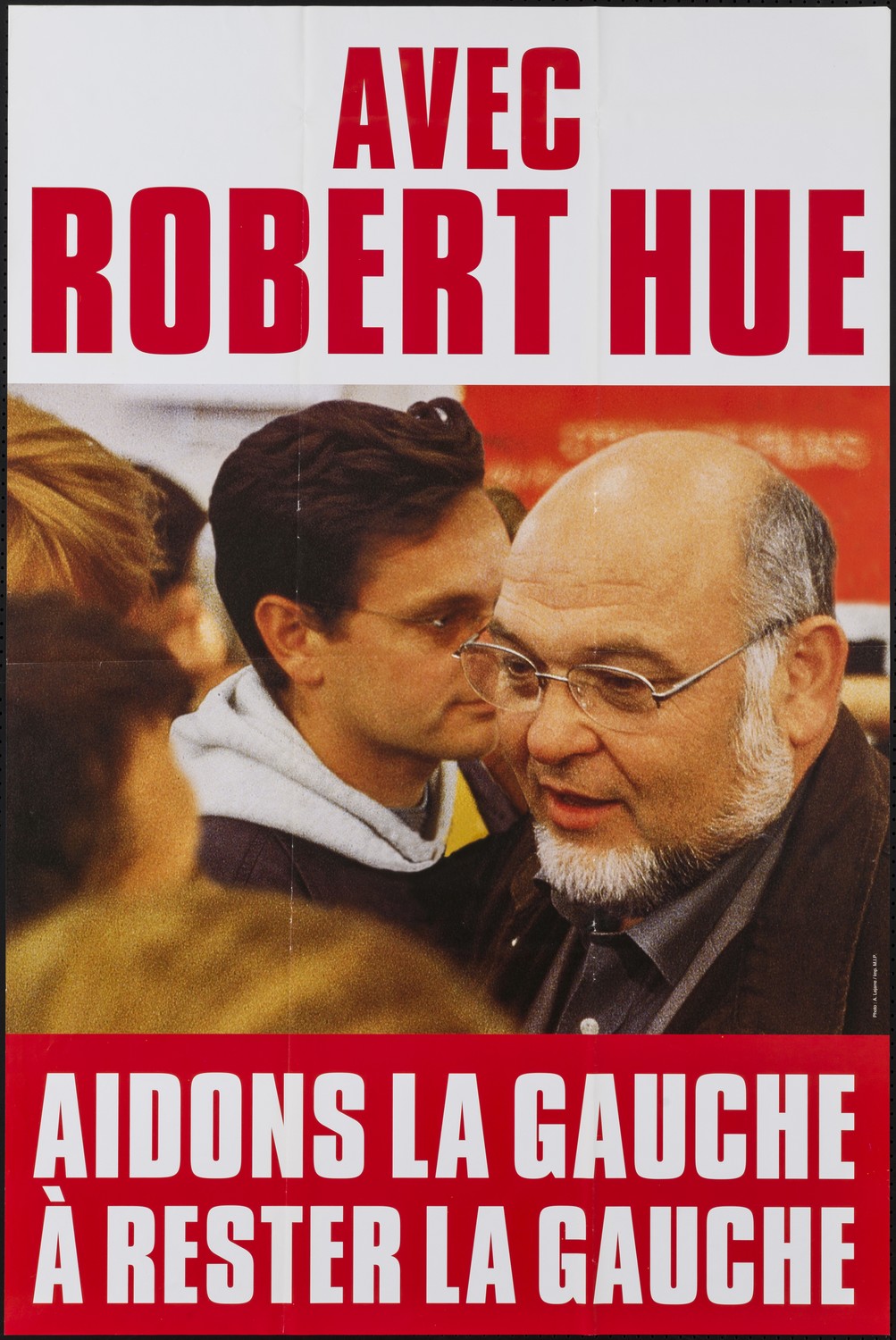 Another note: the PCF was the king of personality-cult type of poster (see this page for a more extensive comment on this, as well as a couple of references of books on the subject of Soviet-era PCF flyers), so it’s not entirely out of character for them to have a poster centered around a person, although the historical candidate of the 1990s, Robert Hue, chose often to have a crowd around him, but that also corresponded to his jovial and communicative character–Maurice Thorez had crowds below him, as any respectable cult-leader would. No crowd here, but the poster’s full face reminds me of the full face, single-figure posters of the 1930s-1950s, often featuring families. The intent is slightly different, as these would often look above the audience to the future, but it wants to be hopeful. This corresponds to the slogan, La France des Jours Heureux, which any respectable French historian will immediately recognize as similar to the 1936 Left Front (le Front Populaire) sort of vocabulary.